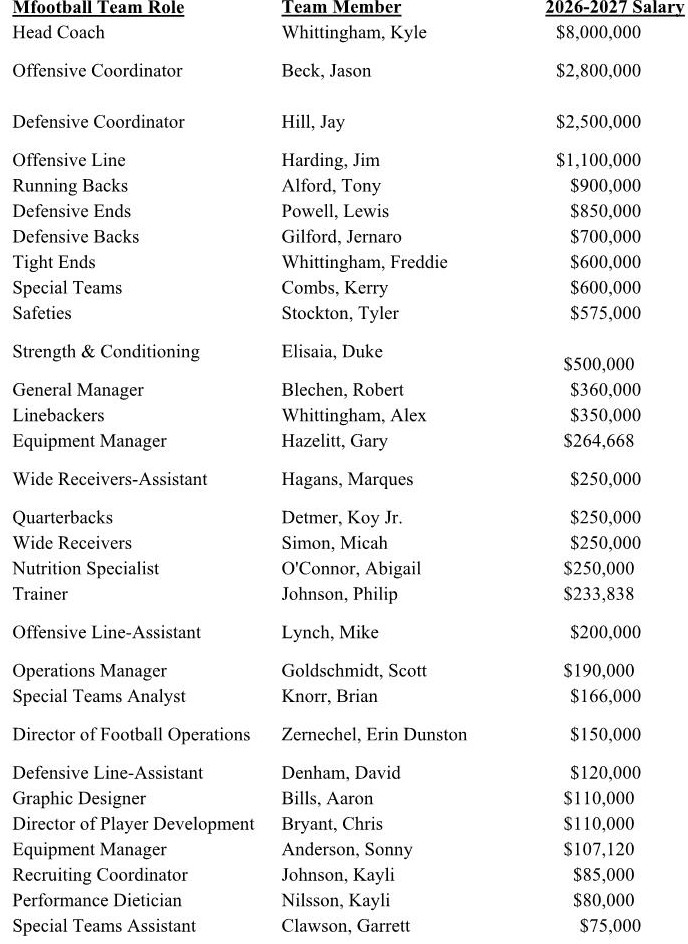 | UM Sport | Head Coach | 2015 Salary | W/M | Years | Total Comp. |
