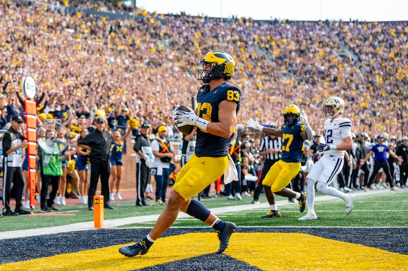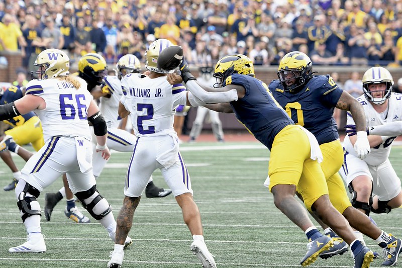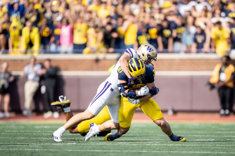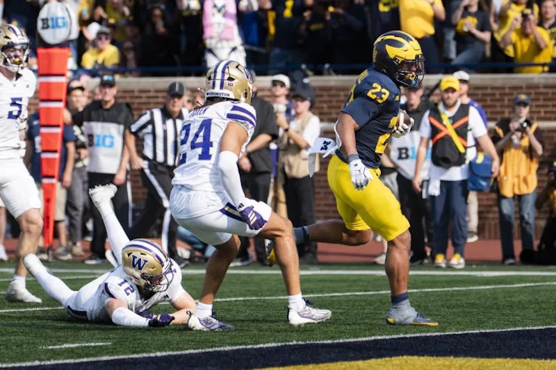 Defense came up big in the second half! The Wolverine defense allowed the Huskies 249 net yards with 40 on the ground; they were 6 of 14 in 3rd down conversions with 14 first downs. The defense only allowed Washington 4 first downs in the second half, and forced 3 turnovers. Demond Williams hit 20 of 32 passes for 209 yards, and was sacked twice for -19 yards in 5 carries. Jonah Coleman ran 16 times for 50 yards, and caught 3 passes for 41 yards. Raiden Vines-Bright caught 3 passes for 35 yards including a 31 yarder that set up a red zone. Denzel Boston caught 4 passes for 71 yards including a 48 yarder that set up a red zone. Dezmond Roebuck caught 3 passes for 27 yards. Jimmy Rolder led the defense with 8 tackles and an interception. Ernest Hausmann had 7 tackles, and Zeke Berry had 6 stops. Cole Sullivan had a big interception near the end of the 3rd quarter that set up a red zone, and broke the 7-7 tie; it was the play of the game.