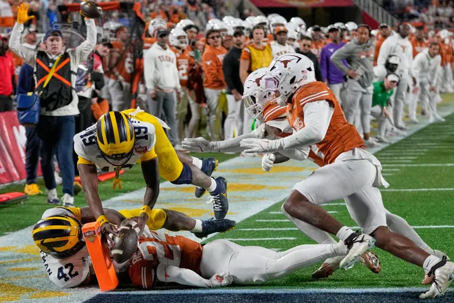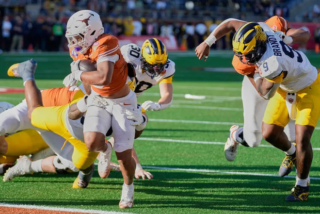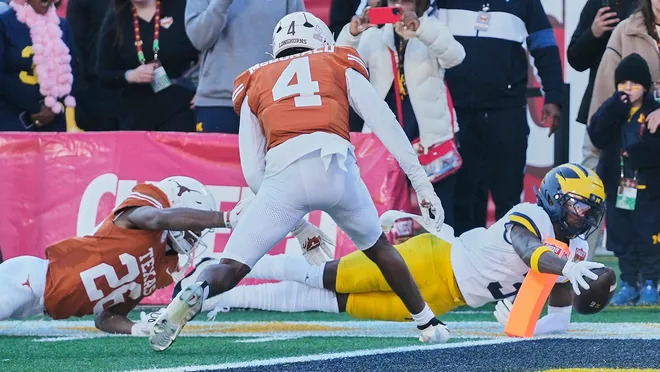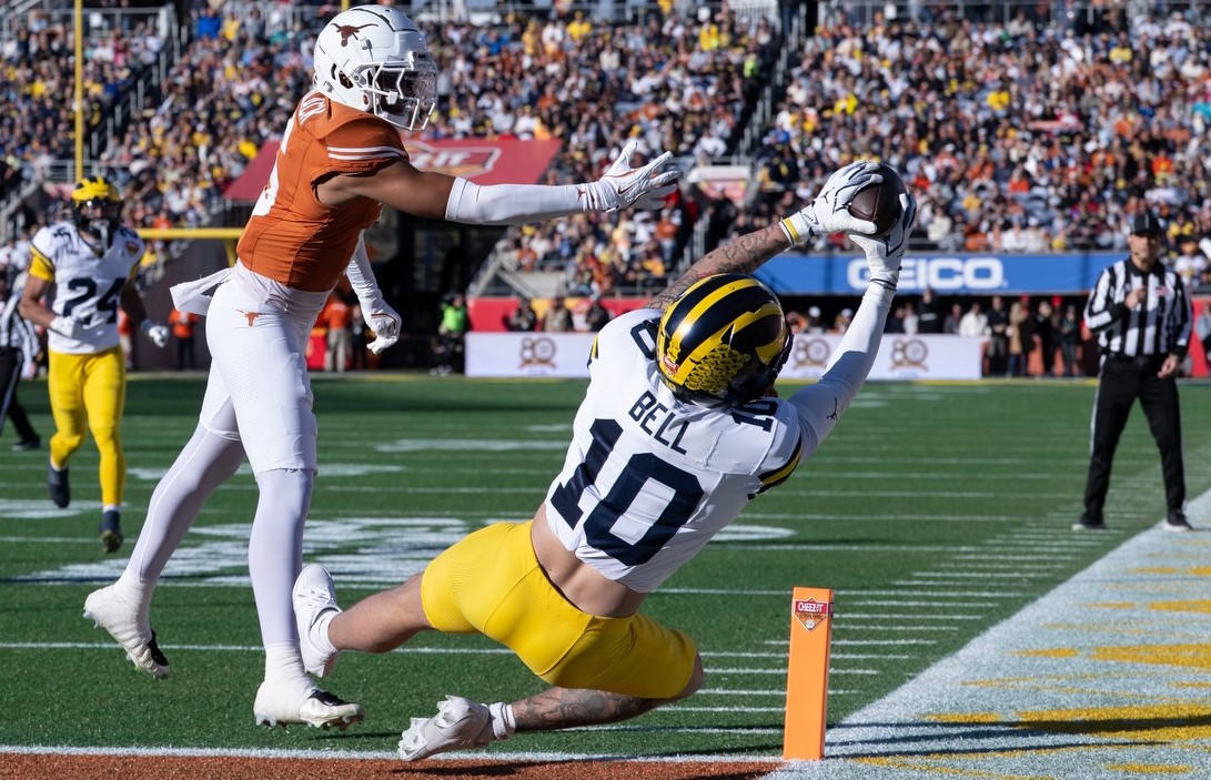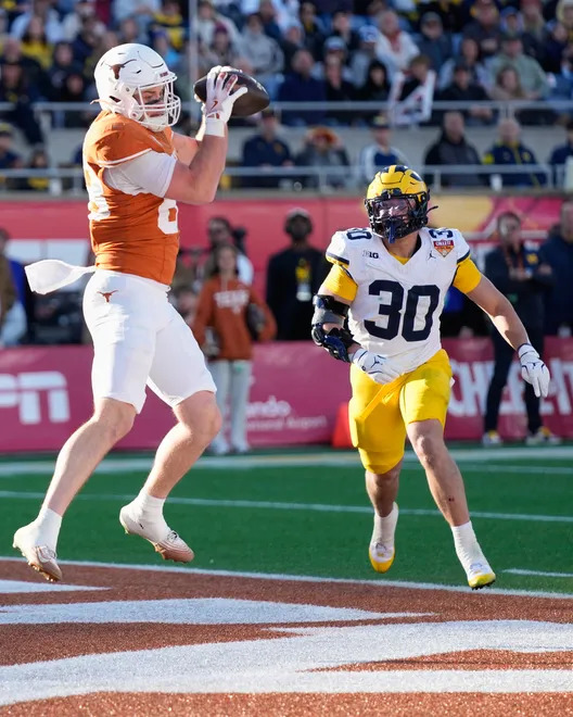 Defense was a sieve! The Wolverines allowed Texas to gain 456 yards with 235 on the ground; the Longhorns were 5 of 13 in 3rd and 4th down conversions with 24 first downs. Arch Manning hit 21 of 34 for 221 yards and 2 TDs, and ran 9 times for 155 yards and 2 more TDs. There were no sacks on Manning, few hurries, and only one quarterback hit as he faced little pressure from this Michigan defense. Christian Clark ran 20 times for 105 yards and a TD. Jack Endries caught 5 passes for 35 yards and a TD. Emmett Mosley caught 5 passes for 51 yards. Kaliq Lockett caught 2 passes for 35 yards including a 30 yard TD pass over Jyaire Hill that put the Longhorns ahead for good with 6:54 to go. Ryan Wingo caught 4 passes for 64 yards. Defense could only force 4 Longhorn punts, and no turnovers. Cole Sullivan and T.J. Metcalf led the defense with 7 tackles each. Jordan Young was impressive at Safety with 6 tackles.