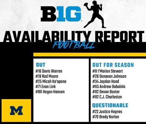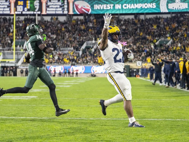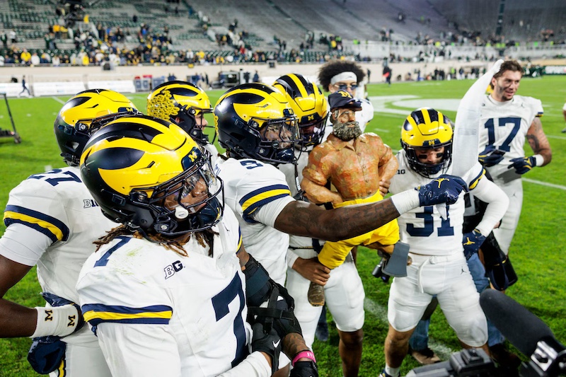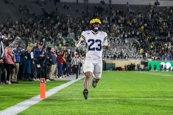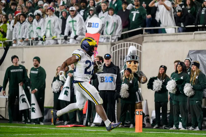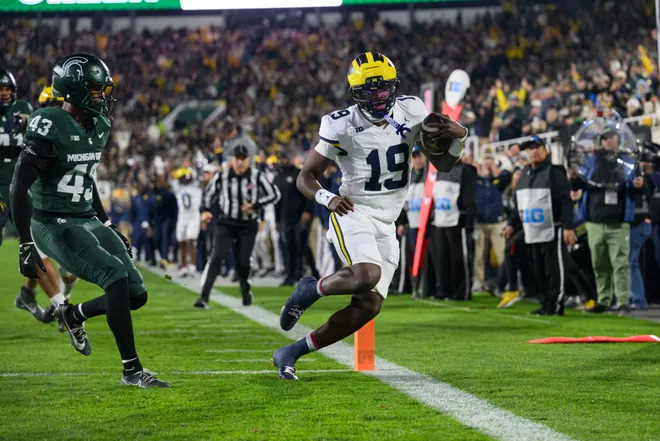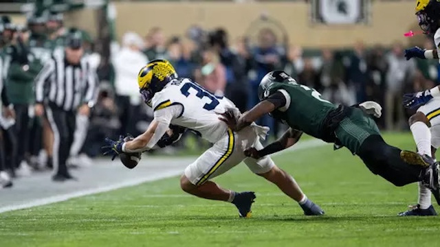Offense could only gain 362 net yards, but rushed for 276 yards; they were 7 of 16 in 3rd and 4th down conversions with 20 first downs. Bryce Underwood hit 8 of 17 passes for 86 yards, and ran 5 times for 26 yards and a TD; he also recovered a high snap deep in Wolverine territory that saved a turnover. Justice Haynes ran 26 times for 152 yards and 2 TDs, and caught 3 passes for 19 yards; he also fumbled for a turnover. Jordan Marshall ran 15 times for 110 yards and a TD. Semaj Morgan ran a reverse for 6 yards. Andrew Marsh caught 3 passes for 54 yards. Donoven McCulley caught one 9 yard pass. Marlin Klein caught a 4 yard pass. Jordan Hall led the Spartan defense with 9 tackles, but he left the game in the 3rd quarter with an injury.