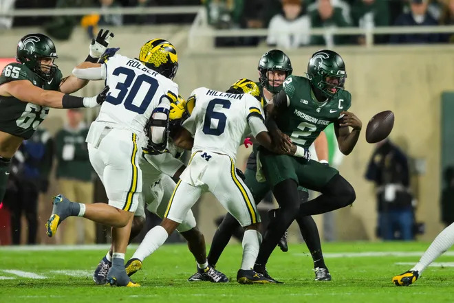 Defense forced the Spartans into five "three and outs;" however, they gave up 305 net yards with 115 on the ground. We forced Michigan State into 7 punts, and gave up 18 first downs; the Spartans converted 6 of 19 in 3rd and 4th down. Makhi Frazier ran 14 times for 109 yards. Aidan Chiles hit 14 of 28 for 130 yards, but ran 15 times for -7 yards after 4 sacks and a TD. Nick Marsh caught 6 passes for 75 yards. Michigan held a 1 minute time of possession advantage, but the Spartans ran 6 more offensive plays. Jimmy Rolder led the Wolverine defense with 10 tackles including a sack, a fumble recovery, a pass deflection, and a big 4th down stop.
